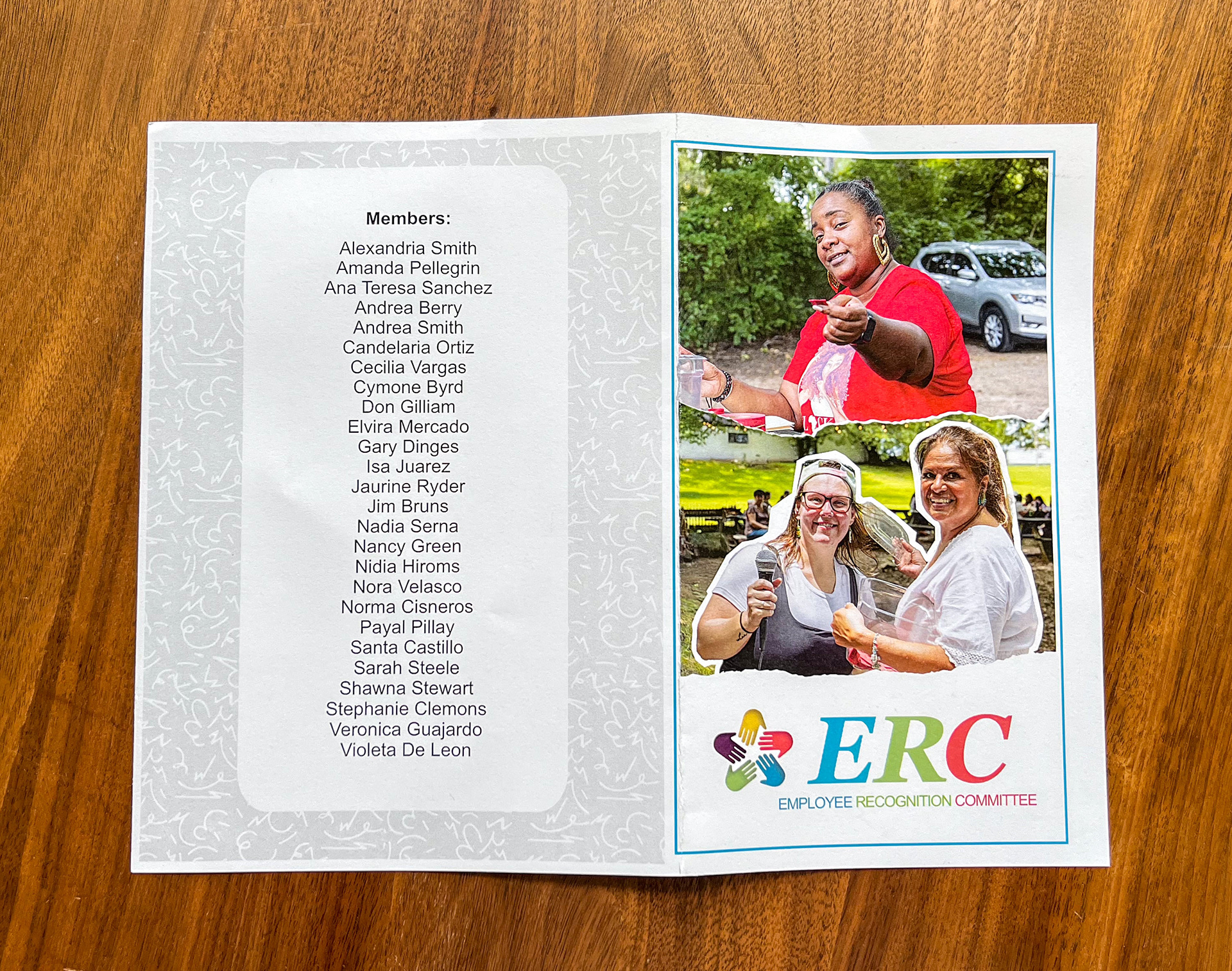 I developed core brand assets for the ERC, including typography, color palette, and logo variations, and applied those elements across collateral for both day-to-day use and larger events. That included t-shirts, printed brochures, and event signage. Each piece was designed to feel cohesive while reflecting the energy and appreciation behind the committee’s mission.