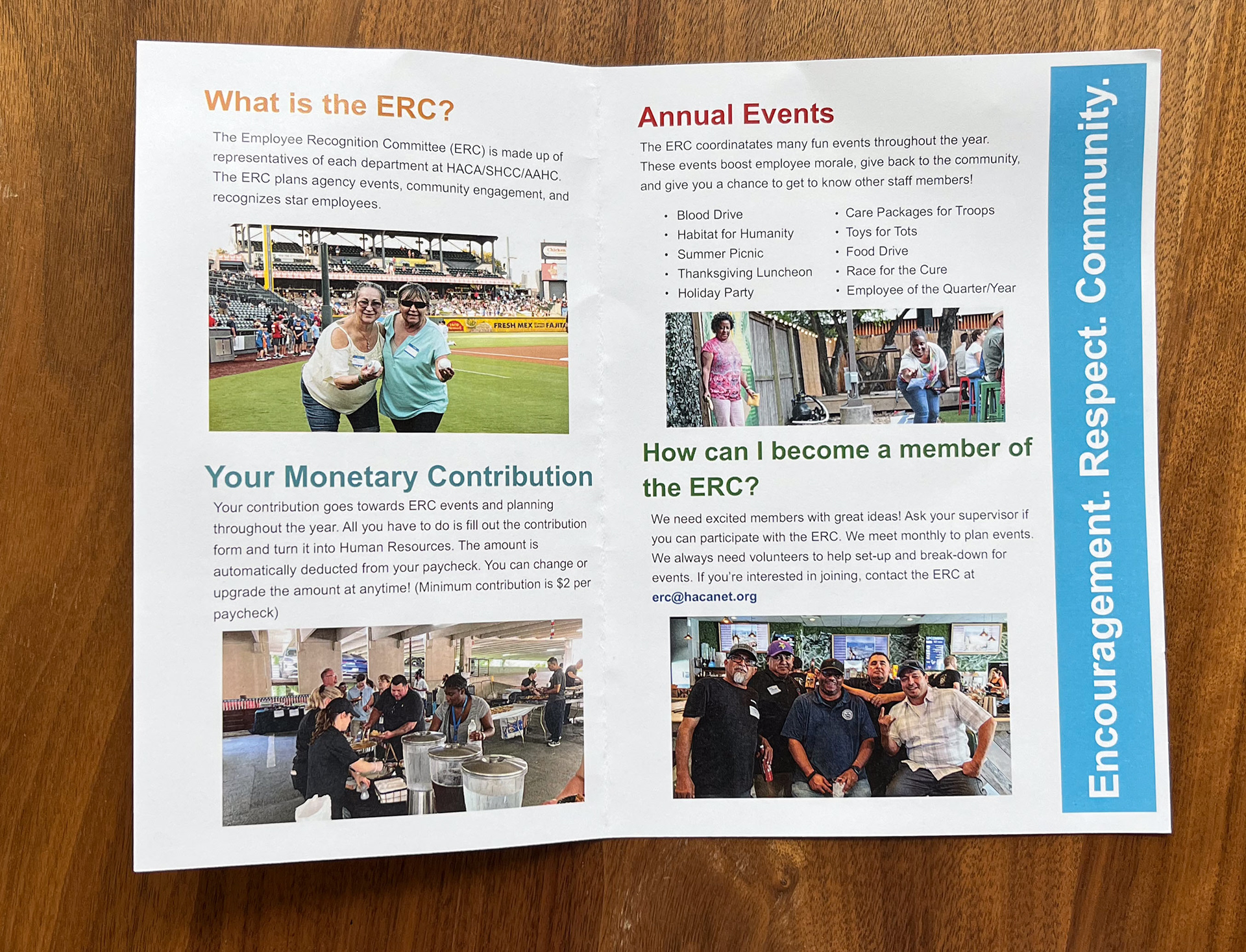 The Employee Recognition Committee (ERC) branding project focused on building a visual identity that could support HACA’s efforts to celebrate and acknowledge staff across the organization. The ERC leads internal initiatives to recognize employee contributions and build community, and this project aimed to give their work a clear and consistent presence across events and materials.