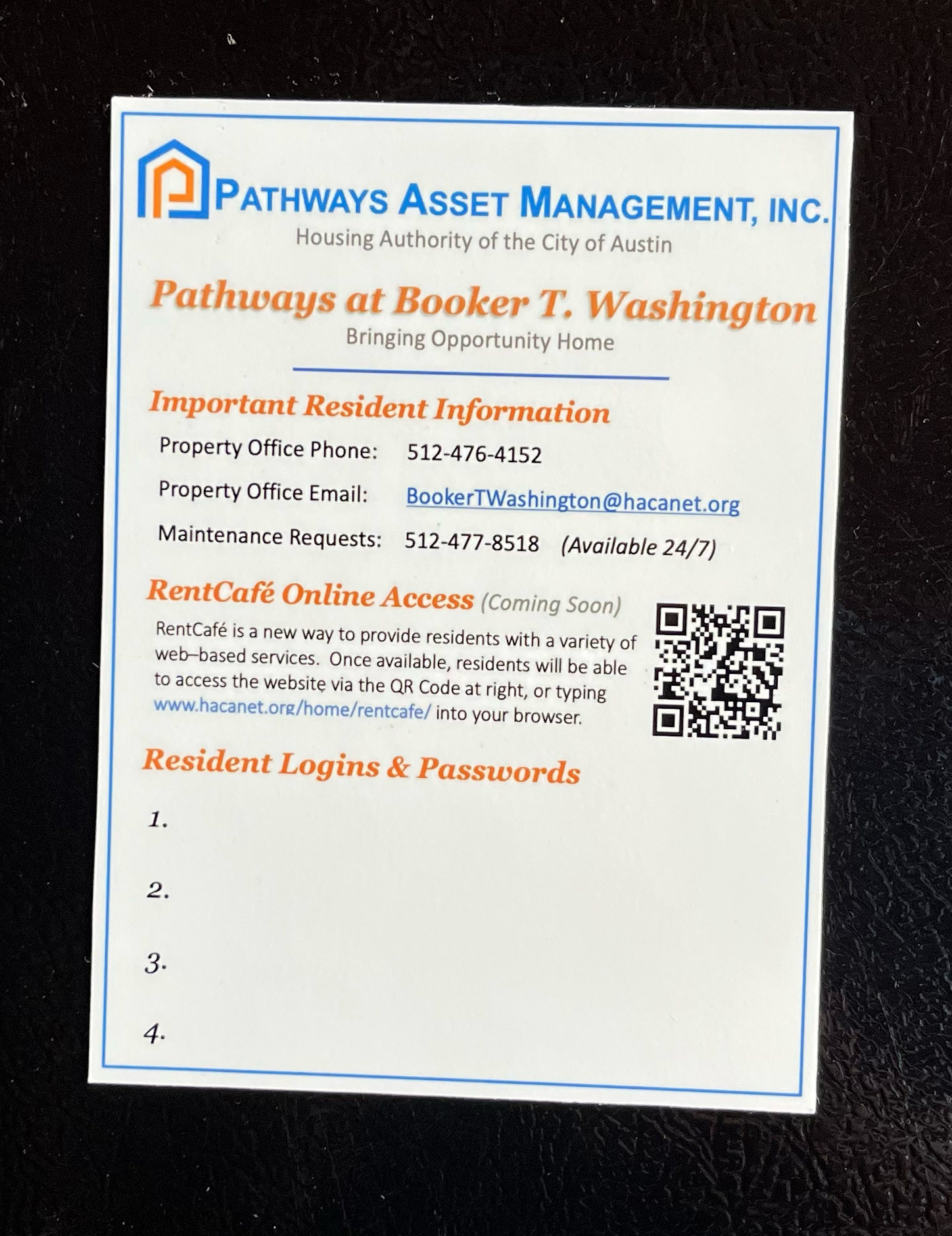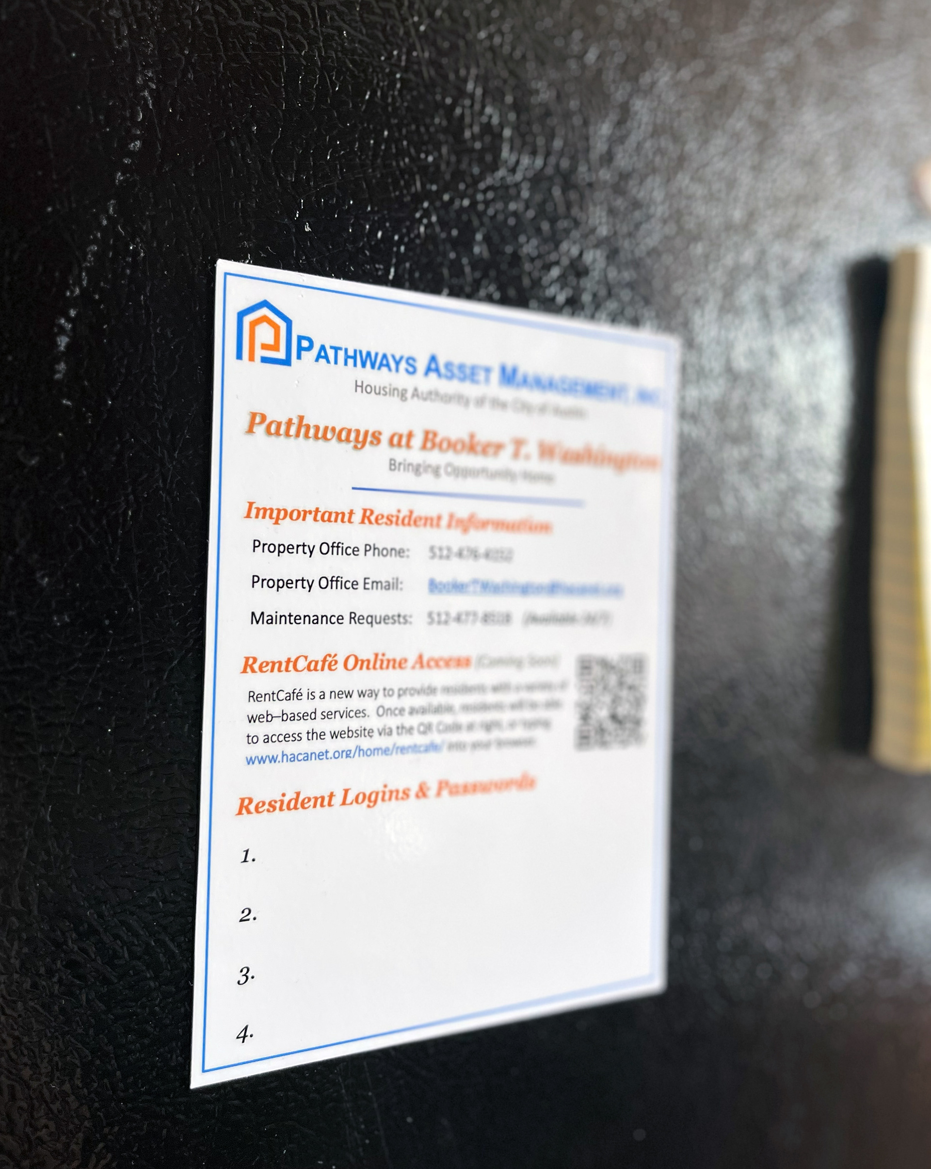 The campaign launched with a major activation event held on lease renewal day, where staff helped residents create their RentCafé accounts in real time. To solve the login retention problem, each resident received a custom fridge magnet featuring their property name and space to write down their login information. These magnets were designed specifically for each property and gave residents something tangible and visible to reference when accessing their accounts.