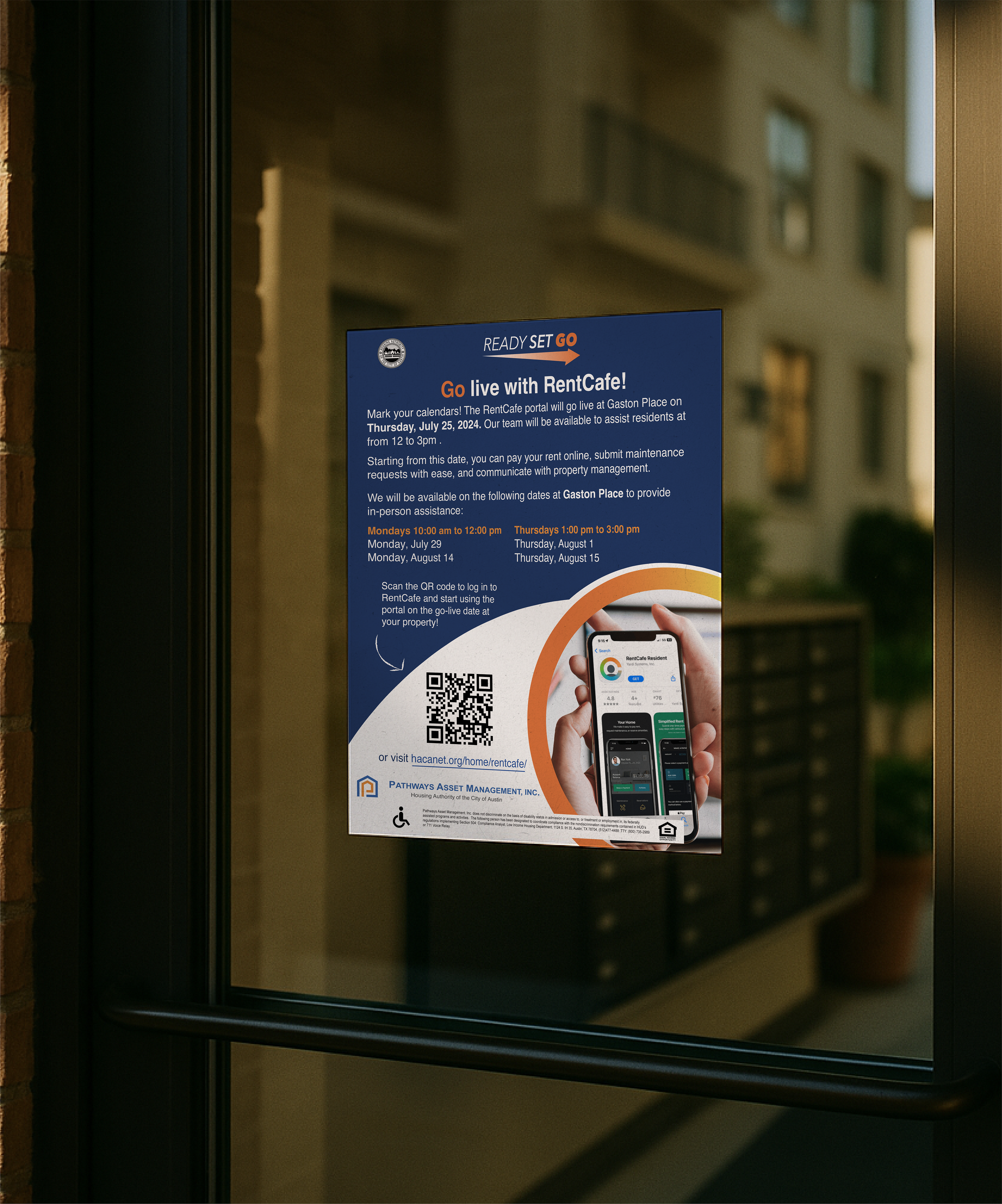 Several months later, I rolled out the "Ready • Set • Go" communication series. The Ready flyer was standardized across all properties to introduce RentCafé and explain its benefits. The Set materials were customized for each property, listing specific dates and times when on site support would be available for questions and troubleshooting. The Go flyers announced each property's official activation date and provided final reminders about accessing the platform.