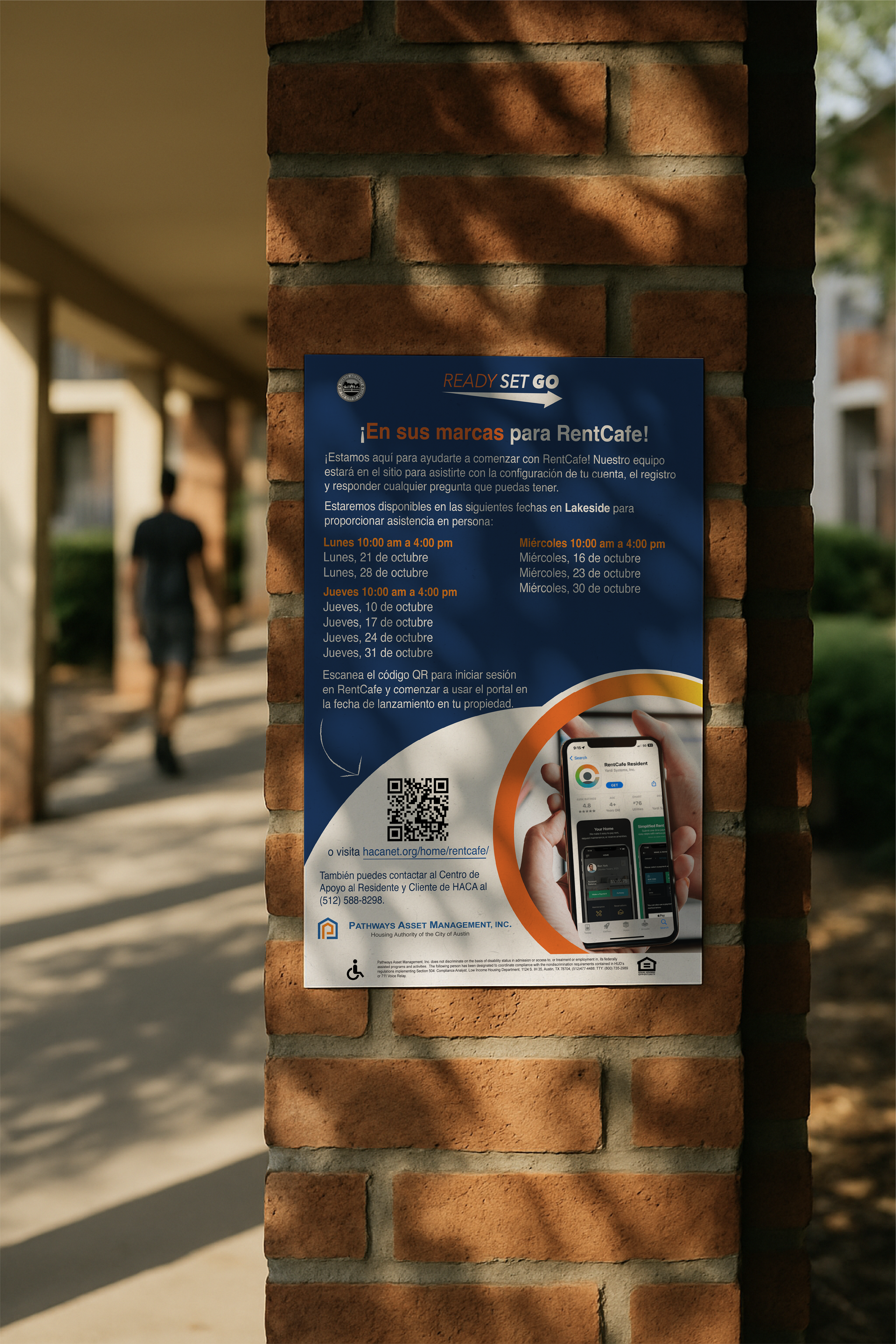 I developed a multi phase campaign that combined large scale events with targeted communications tailored to each property's needs. The approach recognized two key challenges: many residents had limited experience with technology, and frequent email changes made it difficult for people to maintain consistent account access. All materials directed residents to hacanet.org/rentcafe for additional resources and support.